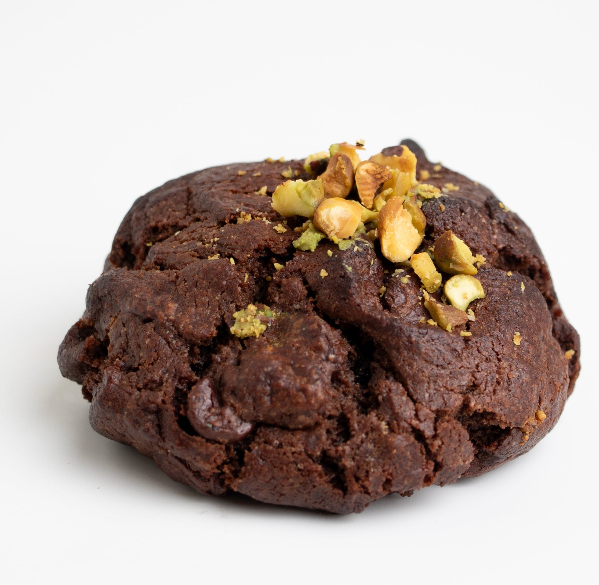 Deliciosa galleta de chocolate con chispas de chocolate rellena de crema de pistache y pasta kataifi.