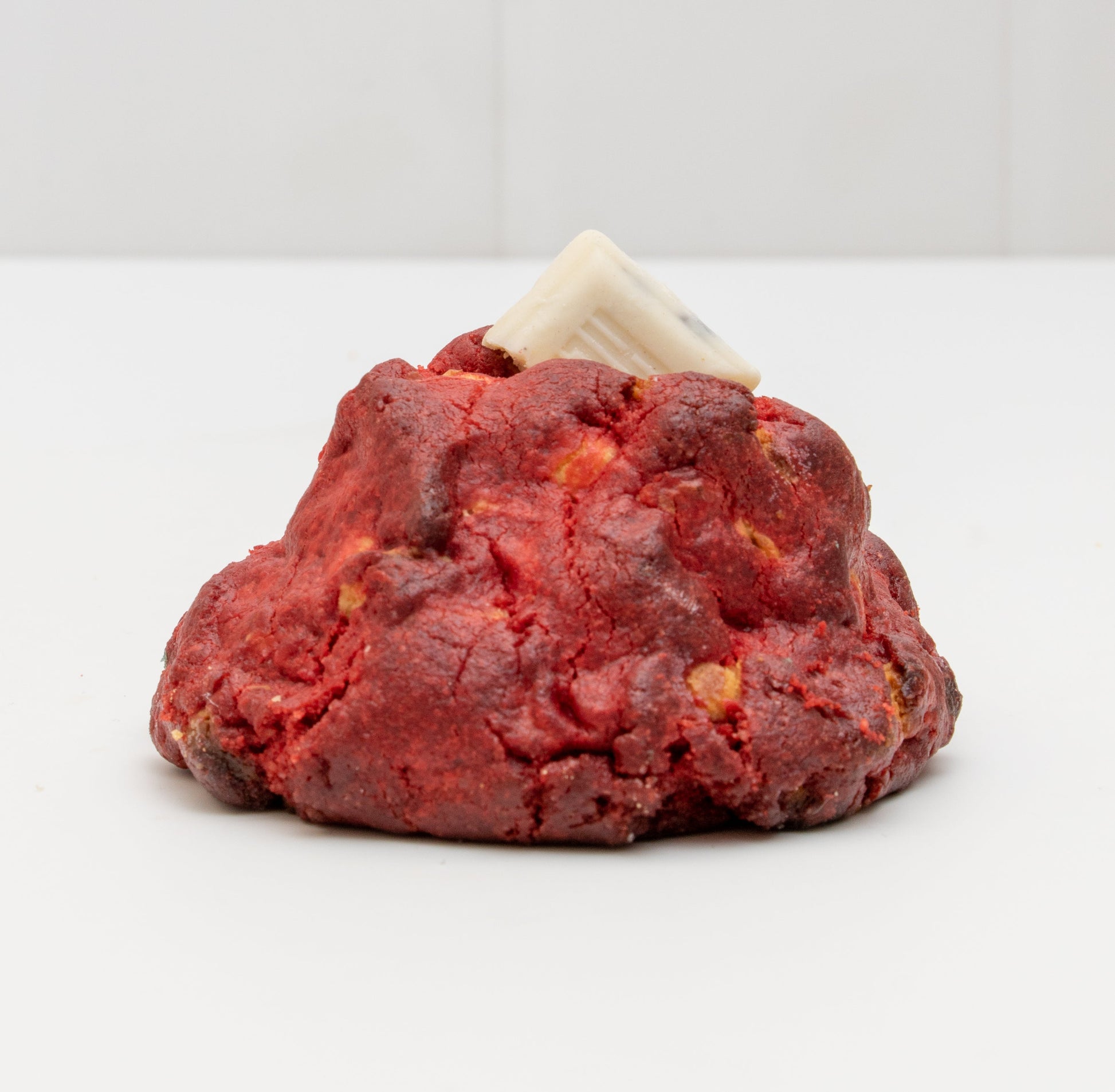 Galleta red velvet con chispas de chocolate blanco y relleno de cheesecake.